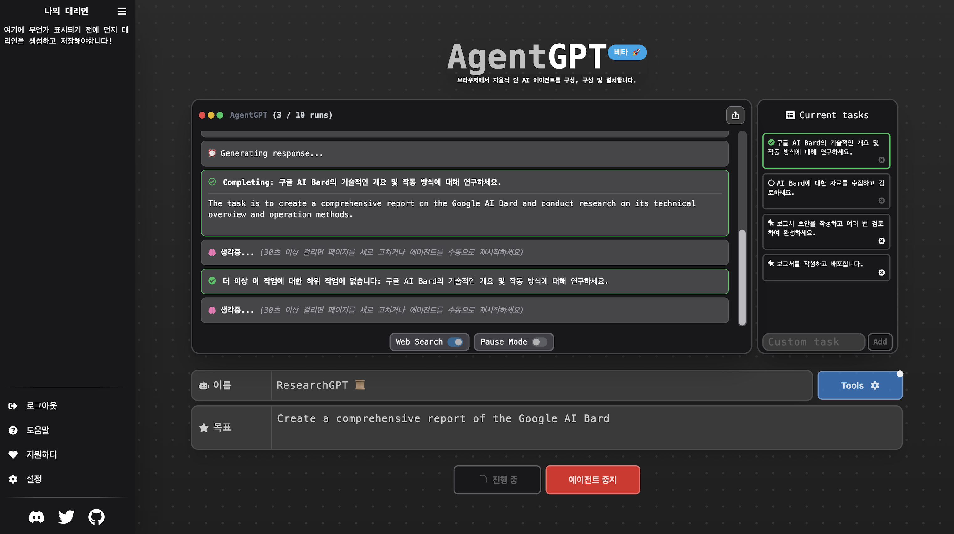 아래 화면은 AgentGPT가 구글 바드에 대한 포괄적인 보고서 작성 목표를 위해서 웹 서치를 진행하는 장면입니다. 완료된 작업은 pdf 파일 형태로 로컬에 다운로드받을 수 있습니다.