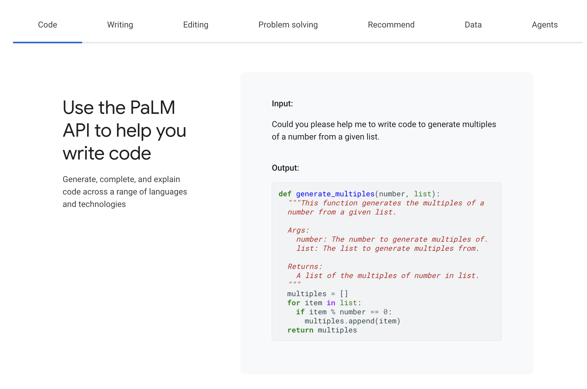 PaLM API로 수행할 수 있는 코딩, 글쓰기, 편집, 문제 해결, 추천, 데이터, 에이전트의 역할에 대해 아래의 홈페이지(https://ai.google/discover/palm2)에서 자세하게 설명하고 있는데요, 한번 확인해 보시면 좋을 것 같습니다.