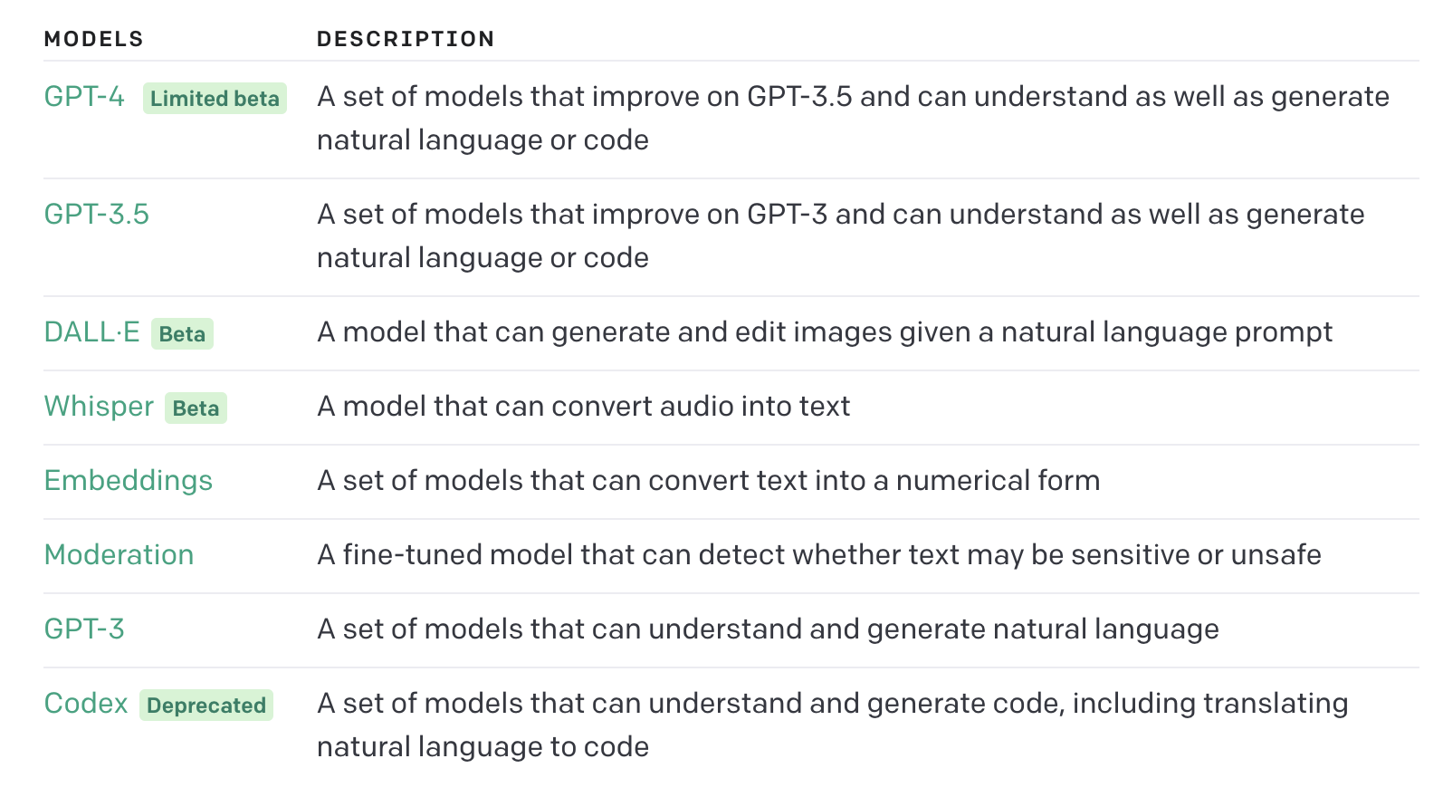 아래는 OpenAI가 제공하는 모델들의 리스트입니다.